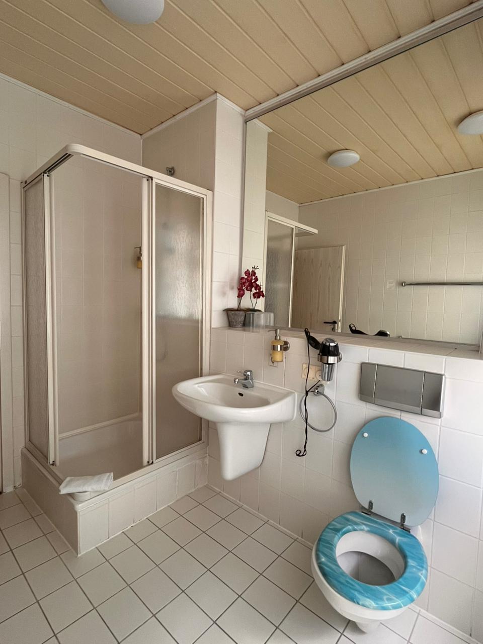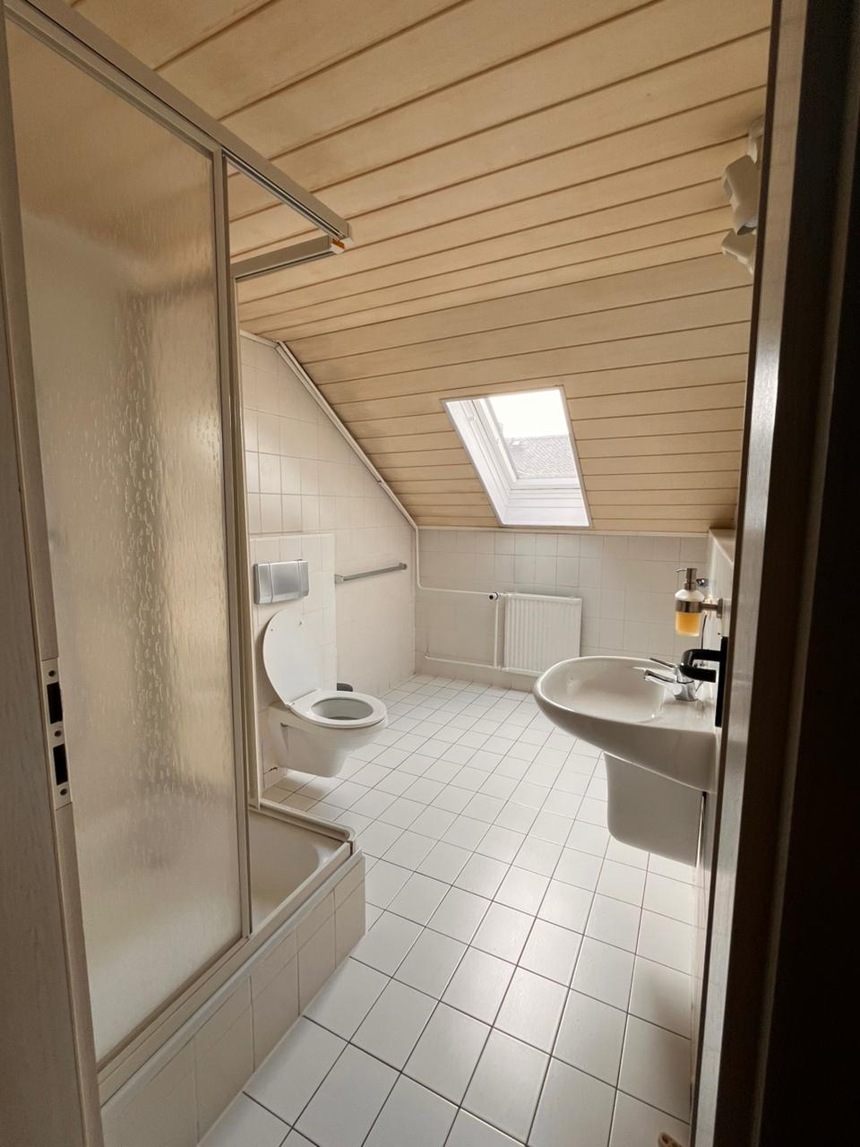 Bad mit Fenster, Dusche, WC, Föhn und Hygieneartikeln